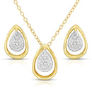 Indulge in the ultimate luxury with this exquisite diamond teardrop earring and necklace set, a must-have addition to any jewelry collection. This dazzling teardrop pendant combines the sparkle of round diamonds (.25twt) set in sterling silver with yellow gold overlay suspended from an 18" cable chain. Each earring features .05twt round diamonds, expertly set to catch the light from every angle. The classic teardrop shape is both feminine and timeless, making this set the perfect choice for any occasion.