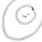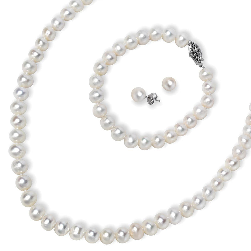 Classic and timeless, this lovely pearl set adds a touch of sophistication to any look. 7-8mm white freshwater pearls set with sterling silver filigree clasps. The earrings are secured with post backs. The bracelet measures 7", and the hand-knotted necklace measures 18".