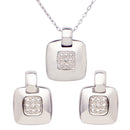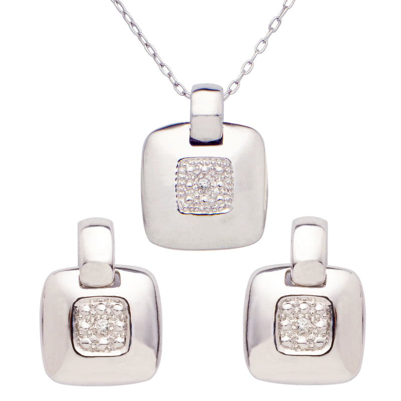 Style is knocking at your door with a geometric spin on the doorknocker classic. Contemporary diamond doorknocker earring and necklace set: .03twt round diamonds, sterling silver, 18" cable chain. The necklace features .01ct round diamond set in high-polished sterling silver, suspended from an 18" cable chain. The doorknocker earrings feature .02twt round diamonds.