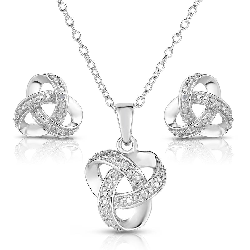 No better way to express your endless love than with this diamond Love Knot earring and necklace set. Classic and beautiful, and perfect for every occasion. .03twt round diamonds set in sterling silver, 18" cable chain. Matches well with ring JR848.