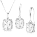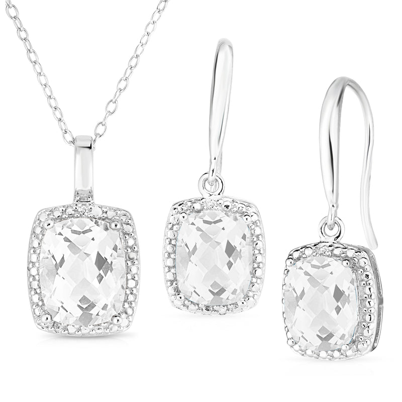 Classic meets contemporary with these romantic 9x7mm genuine white topaz and diamond earrings and 10x8mm white topaz and diamond pendant. .03twt diamonds set in sterling silver; 18" cable chain