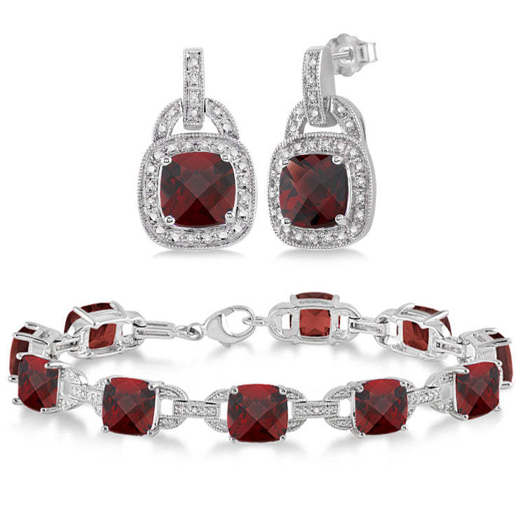 Add a pop of color to any and every outfit! Stunning 7mm genuine cushion cut garnet bracelet and 8mm garnet earrings set in sterling silver and .18twt round diamond accents. 7.5" long bracelet. Beautifully express your love for her with these radiant garnet and diamond earrings. Crafted in luminous sterling silver, these earrings feature a centrally staged cushion-cut garnet that are gracefully complemented by 20 sparkling single-cut diamonds in a pavŽ setting. Total diamond weight is 1/10 ctw, and each cushion-cut blue topaz measures 8x8mm.