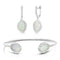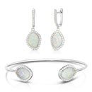 Deco design with a contemporary twist: Sterling silver cuff and huggie earring set updated with a dash of sparkle by delicate 12x10mm organic-shaped opal slices. Deco designs with contemporary twists. The opal slices are bordered by prong-set white sapphires set in high-polished sterling silver. The huggie gets a contemporary twist with opal drops that are set into a fiery ring of white sapphires. Secured to the ears with omega clips and posts. This jaw-dropping set is guaranteed to turn heads every time you wear it.