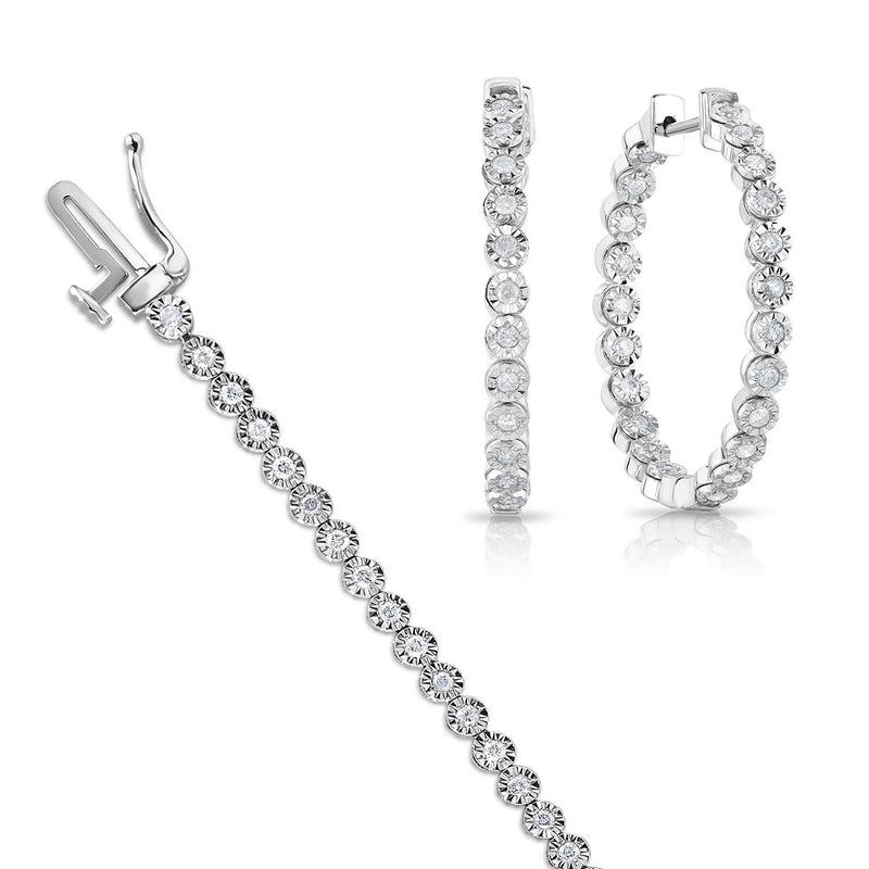 Bring brilliance to your ensemble when you step out wearing this timeless hoop earring and bracelet set boasting brilliant 1 3/4twt round diamonds set in high-polished 10k white gold. They feature diamond-cut miracle plates for even more magnificent shimmer and eye-catching sparkle. One of the most classic, wear-anytime, wear-anywhere designs, the inside-out hoop in this set is a must-have. These gorgeous 25mm inside-out diamond hoop earrings are pavŽd inside and out with brilliant-cut diamonds.