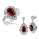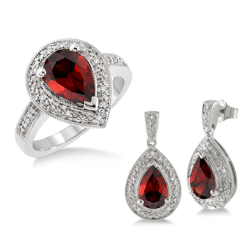 Keep life colorful with the happy hue and standout style of this sterling silver garnet and diamond earrings and ring set. In the earrings and ring, enchanting 9x6mm pear-shaped garnets are perfectly perched amidst high-polished sterling silver, with .10twt diamonds lending extra shimmer and shine. The earrings secure with friction backs. Matches well with 18" necklace JN811-GAR. .20twt diamonds