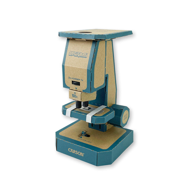 Experience the fun of assembling your very own microscope with the Optigami Build-Your-Own Cardboard Microscope Kit. The powerful 50-400x microscope can be used as a stand-alone, or it can become a digital microscope by attaching the smartphone platform to help capture photos or videos of your exciting finds. Includes: 13 prepared slides, 2 blank microscope slides with coverslips, and (1) eye dropper. Uses 2 AA batteries (not included). Fits all phones. For specific information on your model, visit: www.carson.com/multicam