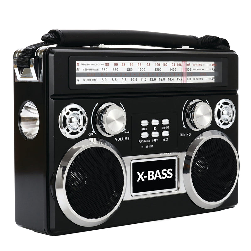 This 3 band radio offers AM FM SW and MP3 playback. Bluetooth wirelessly streams audio from a smartphone tablet computer and more. High sensitivity receiver. USB SD MicroSD and auxiliary inputs offer more music playback options. Built-in torch light. Rechargeable battery. Telescopic antenna. Torch light lasts 8-10 hours and radio for 2 hours. AC Power supply: 110/230V 50-60Hz. DC 6V power (requires 4 D batteries - NOT included). Includes carrying strap.