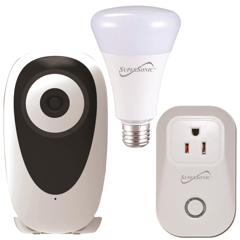 The indoor security camera monitors 24/7 with clear view even in the dark. Built-in mic and speakers allow two-way audio. Expandable memory up to 128GB via MicroSD. Smart LED bulb can change colors. 7W power. 550LM luminosity. Wifi plug allows you to control appliances from anywhere.. Timing function: power up and power down any appliance at specified time. 110-240V working voltage. 2000W max power. 10Ah working current. Under .3W power consumption. Overload protection. All 3 pieces can be controlled anywhere with Android and iOS.